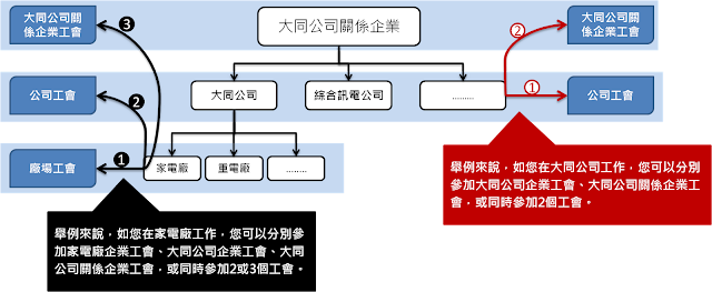 ‧如果您在單一廠場工作,您可以分別參加該廠場工會、該公司工會、大同公司關係企業工會,或同時參加其2 或其3 個工會;(參考下圖左側)